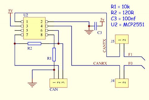 I believe Geoff is going to bring out a version of MMBasic that supports CAN using PIC32 Pins F0 and F1. This is the circuit I have used on the UBW32-MCC PCB. It would be a piece of cake to wire this onto the proto area of the CGCOLORMAX. J4 and J5 are jumpers, and if you are going to always want CAN they can be simply ignored and wired across. CAN header is GND, CAN-H, CAN-L (pins 1,2,3). R2 is Bus termination and can be ignored if not required.