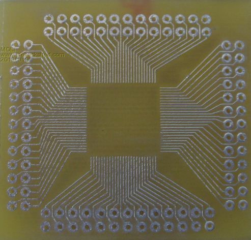 I have made a lot of PCBs using the Kinsten method (UV)and wondered how hard it would be to etch a 100 pin pic32 footprint. I am staying with Downwind so we decided to give it a go. The trace size is about the same as for "through pin" tracks with which I have had fair success. The 100 pin fotprint is a bit more daunting, but we did up some artwork on plain paper using a mono Brother laser, exposed and etched a board.