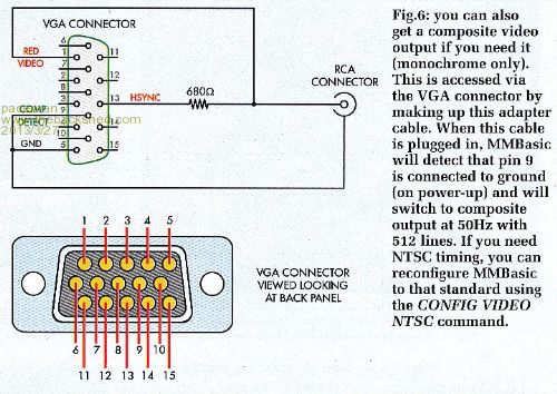 There is a track missing on the UBW32-MCC PCB, associated with the auto-detect for Composite Video....the fix is easy though....if you wish to use pin 9 as a composite/VGA select pin on the UBW32-MCC PCB you will need to run a jumper from VGA pin 9 to UBW-C14 (about a 25mm or 1" link).
