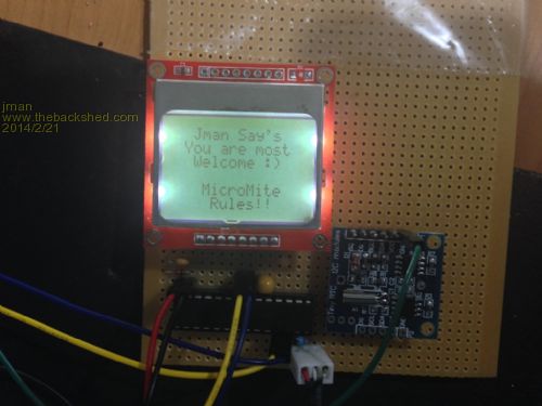 This are driven by the SPI interface They are completely graphic displays (No built in fonts) But his means we can make our own cool fonts and pictures In my previous I made an error the resolution is 84x48 They are 3.3v so perfect for the UMite. add a 47ohm resistor in series with the backlight Attached is the code I used for Clock / Temp display in the Pic. With the Maximite I normally load the fonts from the SD The little board in the picture has a DS1307 and 24c32 eeprom I have also used the eeprom to store the fonts. The attached listing has the fonts in the main program 2014-02-18_072256_Nokia5110Clock.zip Take a look at the listing the fonts are near the bottom. There a few utility's that will convert BMP's to Hex codes I will dig them out and post them Regards Jman |