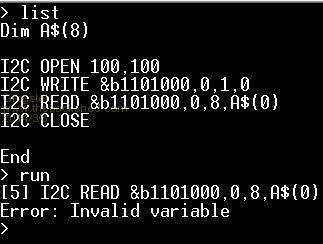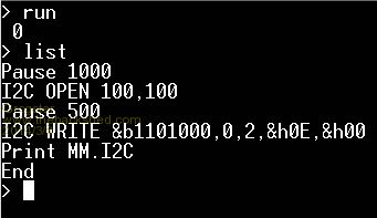 I'm lost already with the I2C. How do you specify the read-write address in the device? This is NOT the slave-address for the device, but the actual registers that you want to alter within the device? Do I just send two bytes? Byte 1 is the register, and byte 2 is the data to be written to that register? At this stage, just trying to write $00(h00) into address $0E on the 3231, which is the square-wave output. By default and without battery, it is 32kHz, but if you write $00 into address $0E on the 3231, this output changes to 1Hz, which I have an LED connected to. I DID get this working in PICAXE basic a year or two ago, but not sure how to port this to the uM... PICAXE code was: 'DS3232 tester 1A #picaxe 40x2 #no_table #no_data symbol x=b1 symbol key=b2 symbol video=D.2 hi2csetup i2cmaster,%11010000,i2cfast,i2cbyte 'Configure I2C for RTC communications wait 5 'Allow LCD screen to fire up serout video,T9600_8,("Talking to clock...",CR,CR) hi2cout $0E,($00) 'Set RTC to pulse LED at 1Hz serout video,T9600_8,("Done.",CR) end Things don't jive here. With PICAXE, you specify the start read/write address within the device, then the byte(s) to write. MMBasic does not allow for specifying a read/write address within the device for your data, so how do you specify that? Hello MOBI. Yes, confused already...