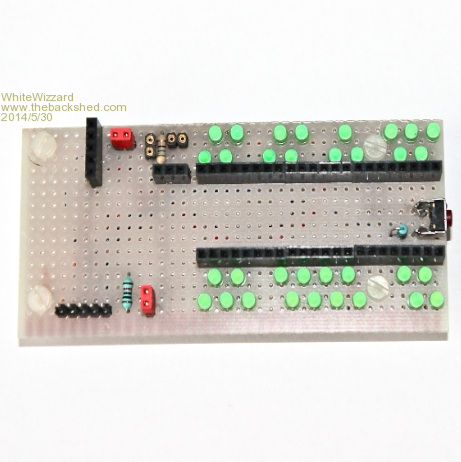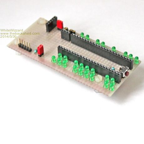 (Note: these are not self-powered LEDs - just reflecting the camera's flash!) I simply load a test program using MMEdit which pulses each of the 33 pins high, one at a time, with a short delay between each pin (to allow me to see the LED on). I have 'staggered' the LEDs so it is visually obvious if a pin is open-circuit (your brain expects to see a zig-zag pattern - if one pin is not connected then you 'see' it much more clearly than if the LEDs are in a straight row (useful tip!)).