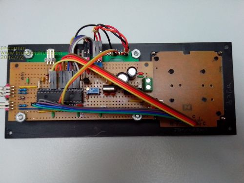 The keypad pin usage (seven lines or eight for a 4x4 pad) is worse than for the parallel display. That can be cut to one though if you use the single analogue input method for the keypad. There's a thread on the forum for that and it works well. It's an even bigger pain running the parallel keypad lines to the panel than it is for the display so using an I2C display and single line analogue keypad seems to me a very neat way of doing it and very economical on pin use. You can also use the 'spare' keys (* and #) for brightness control via PWM or with a 4x4 keypad control other functions. Even so, using a parallel 20x4 display and parallel 4x4 keypad I managed to also get the PWM display brightness control, lamp relay control (opto isolated), lamp 'ON' LED and a buzzer all controlled by the 24 pin chip and with two pins left over. Provision was also made on the board for the console Tx/Rx and ICSP connector (with some shared pins) but it all works. This is what the proto board looks like (actually it's half a proto board). I confess that I did use a couple of surface mounts bits to squeeze things in and the bottom as well as the top of the board was used, e.g. the 3.3v reg on the bottom. Greg