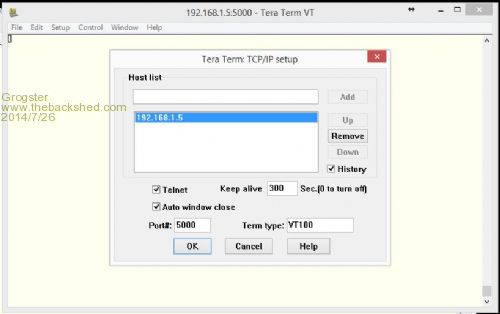 EDIT: I've changed the port number to 23 instead of 5000, as TT help was suggesting that port 23 should be used for Telnet stuff. Same result - talks OK for 5-10 seconds, then all I get are > prompts.