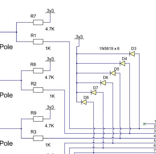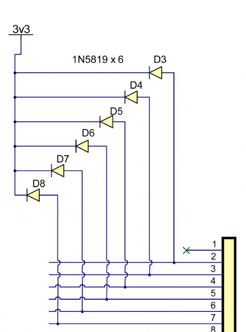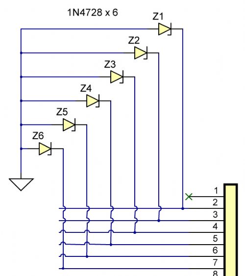 I thought of diodes similar to this concept, but I must be lacking in understanding a little, cos using your image above, if you apply 12v to an input, does this not go roaring through the diode to the 3v3 rail, putting 12v on your 3v3 supply, and blow EVERYTHING connected to the 3v3 rail, and not just the single input pin? I am guessing I am missing something here... I would have thought the first image with the zeners and load resistors to deck would have been the way to go, as you yourself did initially. Smoke makes things work. When the smoke gets out, it stops! |
