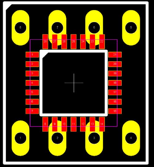 Here is an accurate layout of the QFN over an 8pin socket.. The purple square is the physical size of the chip. It obviously wont fit as shown BUT If you were to use surface mount pins (mounted on the bottom) and not through hole then the QFN mounted on the top and you should have some room for a `couple' of solder link options to enable the same PCB to have 2 or more different pin configurations. All that in a small standard 8pin IC package. Regards, Mick Mick's uMite Stuff can be found >>> HERE (Kindly hosted by Dontronics) <<< |