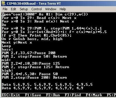 > I assume you mean that the PWM's are connected > to one point through 15k resistors and then the > TX from COM1 is connected to that same point > with a 3k3 resistor. > That one connection point then becomes "audio out"? Precisely. The values can be adjusted for mix as the 3k3 (COM1 is the percussion) |