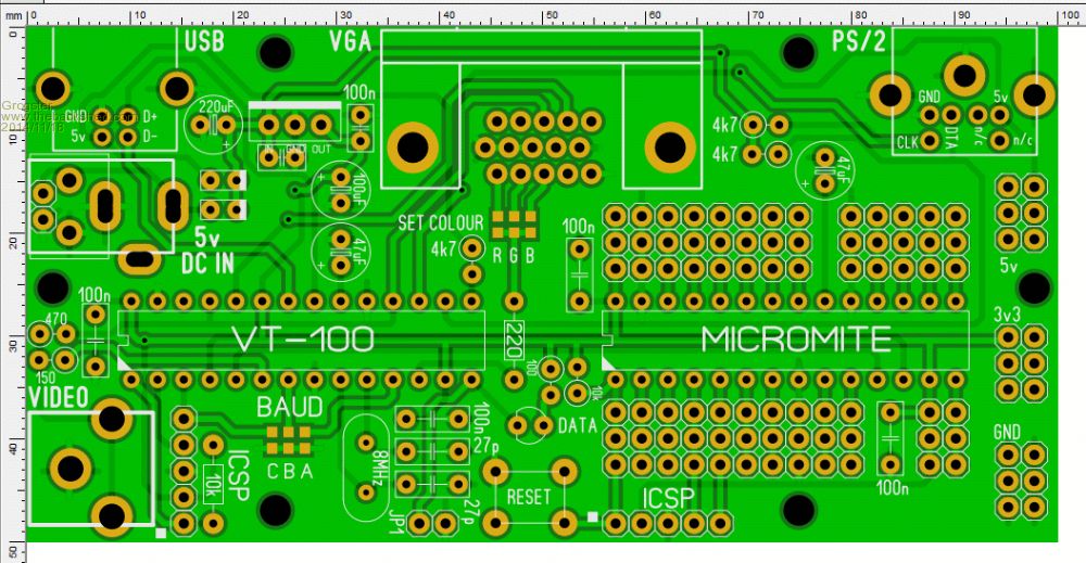 I am not trying to re-invent the Maximite. I was just playing around to see if I could squeeze it all into a 100mm x 50mm board, which is quite small, yet still keep the VT100 and Micromite chips as standard DIL. Naturally, I have had to use some SMD, but most of it is thru-hole.