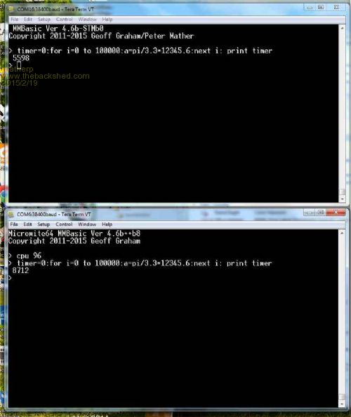I spent yesterday getting the rudiments of the Micromite code working on the STM32F407VG chip (1M flash, 192K RAM, 168MHz clock, hardware FPU). I'm using one of the very cheap STM32F4-discovery boards as the development hardware and the free CoIDE IDE and GCC32 compiler (same compiler as Microchip use) I've got to the point that the console is working and I've set up a 1msec interrupt timer. Basic is operational from the command line but there is no facility to save a program. Although there is 192K of memory, this is split into 128K and 64k sections which makes it more difficult to use. At the moment the code is only using the 128K bit. Before putting in any more effort I though I'd try and run a simple benchmark to test the comparable performance - results below. Basically the performance appears to scale pretty much 1:1 with the relative clock speeds. Comments? If its not clear on the picture the times are: ARM@168Mhz 5598 470@96Mhz 8712 170@48MHz 13626