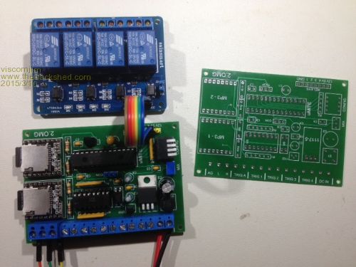 I was asked to create a board that can be used as an "audio repeater" (I never heard of that) with 4 triggers to play some audio for a machine alarm setup. Using an mp3 module and the uMite, this was a piece of cake. One of my buddies saw this and asked if it could play two things at one time. Using two modules and mixing the stereo output worked well. So this board was developed for a Halloween application, which he actually makes a very good living at. (I know, I was surprised at how big this day is.) Using all 19 available I/O pins, the board has 4 triggers for "scare tracks" and 1 trigger for an "ambient" track. All five inputs are optocoupled to the uMite. It uses 2 mp3 modules to handle the sounds. The umite is using the TX Cfunction to talk to the modules. I use a 10k trimpot hooked up directly to an analog input to the uMite to "mix" the volume on both mp3 units, as the volume control is handled by serial commands. It has a 4 position dip switch to allow for different on site configurations, like how to handle triggers, etc. It plugs directly into one of those cheap ebay relay modules to control lights and effects based on the triggers (also optocoupled). I threw in a tsop4838 to read an nec remote control also. On board power supply has a bridge rectifier to protect against wrong power polarity. Just thought I would share another project that uMite and Geoffs efforts have made come true. Many thanks!!!! |