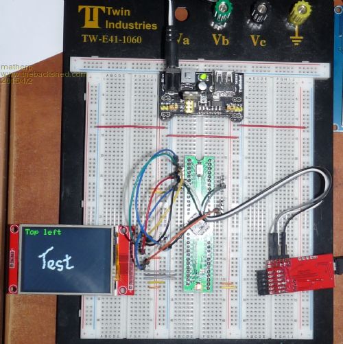 The timeout is specified in milli-seconds. The function will return a value of 0 if a timeout has occured without the screen being touched and 1 if a touch has occured. I've attached two copies of the full test program including the calibration routine. One is configured for the ARMmite driving a SSD1963 800x480 screen (default orientation landscape) and one for the 64-pin MX470 driving a 240x320 ILI9341 SPI screen (default orientation portrait) - see the picture above featuring the mighty Skinnymite! Both are tested as working in all 4 orientations after initial calibration. The code in both cases is identical other than pin definitions, SPI channel usage, and the binary code for the shellsort Cfunction. 2015-04-02_180855_touch.zip To run the code in production the intialisation and main program is as simple as: option explicit option default NONE CPU 96 ' const NSAMPLES=9 'number of times to sample each touch point const t_CS=2 'chip select pin for XPT2046 touch controller const T_IRQ=3 'interrupt pin for XPT2046 touch controller const XLEFT0=1859, XRIGHT0=217, YTOP0=181, YBOTTOM0=1795 ' global constants to define calibration values DIM INTEGER XLEFT, XRIGHT, YTOP, YBOTTOM ' global variables to hold active values DIM INTEGER xvalues(NSAMPLES-1),yvalues(NSAMPLES-1)' arrays to hold raw sample values pin(t_CS)=1 setpin t_irq,din setpin t_cs,dout CONST default_rotation=0 'default screen orientation for this display type, in this case portrait ' this constant must be either 0 = portrait or 2= landscape const screen_width=240 'width of display in use const screen_height=320 'height of display in use dim integer width, height'active values based on current orientation ' 0=portrait, 1=portrait inverted, 2=landscale, 3=landscape inverted DIM integer XSAMPLE0=&HD0 'parameters to hold XPT commands, these may be reversed by the calibration routine 'for a particular application these values can be saved and set as constants DIM integer YSAMPLE0=&H90 DIM INTEGER XSAMPLE, YSAMPLE ' dim integer x,y 'main program variables ' spi2 OPEN 1000000,3,8 display open ILI9341S,1,30,32,31,screen_width,screen_height ' T.rotate(2) display 2,0,0,&H07E0,0,"Top left" main: if t.screenpos(x,y,1000) then if x>3 and x<width-3 and y>3 and y<height-3 then circle x,y,3,&HFFFF,f endif goto main |