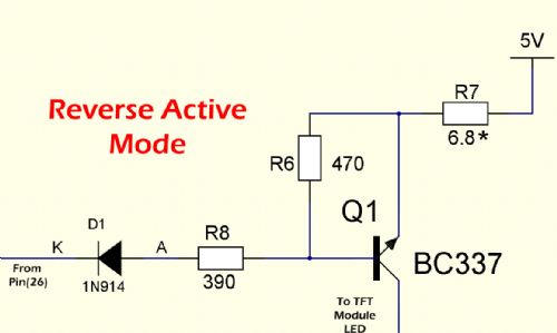 GDay All, My recent BackPack 170 PCB that I just released has a circuit to drive the back light LED that I found rather difficult to get to function correctly. The specification of the particular modules I use has the LED backlight with a Grounded Cathode and requires 3.2V at 60-80mA to the LED pin on the TFT module (there is a series 3R9 resistor on board the TFT module as well). Now obviously the MicroMite cant directly drive 60-80mA so it requires a transistor to switch the required power from one of the power supplies (5v or 3v3). With approx 1v drop across the C-E junction when the transistor is saturated that means the 5V supply must be used. OK.. Simple enough, I have designed transistor switches many times going back 30+ years.. Visualise bigmik rummaging around for a breadboard and a bunch of resistors and transistors.. I dutifully wire up a standard NPN emitter out to the TFT and collector to 5V and driven from the uMite pin via a 1k resistor, expecting it all to work but NO!!!!! It refused to work as expected.. Scratch my head and think a bit more and realise the problem.. as the Emitter would sit at 3.2V the uMite can only output 3.3V so it cannot turn the transistor ON.. Do a Dr. Google (as we do these days when we are lazy) and a myriad of designs later I still havent got one that works.. Now, by works I mean it MUST be able to turn the TFT OFF fully and also ON fully, I could get dimly on (but not off) or off but not fully on.. I tried PNP circuits and NPN ones but still wasnt happy. It was hair raising.. Eventually I found a PNP circuit that used a diode in series with the uMite pin and that lit the proverbial light above my head. Still there was some issue but it was the best so far.. I then tried it with an NPN with collector to 5V and emitter to the LED and it didnt work.. in the process of swapping transistors around (My selection consisted of BC547, BC557 and BC337), I accidentally inserted my BC337 backwards so that it was as shown in the following image (which is the way that BackPack 170 is currently. It was `almost' perfect! After a couple of resistor value changes I got it working really well..