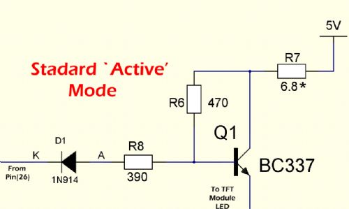 One thing to remember the tft modules Mick's board is designed for runs at 3.3volts.Mick's revised circuit while switching the 5volt railensures that only 3.2 volts ends up on the led pin. I have it running just a single led with no problems as a test.