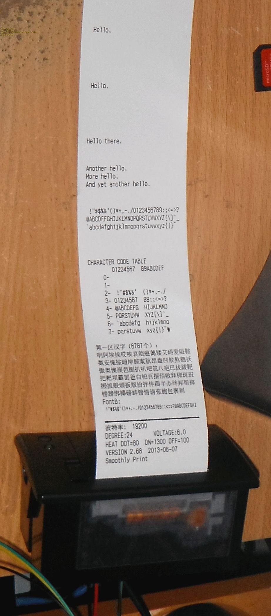 Nice one G. I see under your Chinese message to me that FontB is 41 characters per line (if my eyes are correct) and a leading space (or two). Is there another font offering 80(ish) characters per line? This is just about readable in the photo but what is it like to read when it is front of your eyes (i.e. physically in your hands)? Whilst on FleaBay did you see any wider thermal printers? Sorry for all the Qs but have a requirement for something . . . . WW |