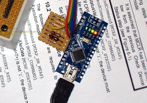 after a few enquiries i've been revisiting earlier work on a cheap ICSP adapter. some of you may have looked at the work darron was doing to use an arduino nano as an ICSP: http://wiki.kewl.org/dokuwiki/projects:nanu-nanu unfortunately darron's solution has a copy of microchip's PE embedded in the nano's code which created some issues with providing a precompiled .hex file that anyone could easily burn. it also has (as far as i can tell) the table of supported devices hardcoded, and the build process to create a .HEX file is pretty much beyond most folks. so, i've created an updated "ascii ICSP" protocol (a variation of 'ascii JTAG' with some extensions), coded it as an arduino sketch, created a .HEX file for upload to a nano, and designed the very simple associated hardware. i've also put together a package containing the bare minimum bits of avrdude to get the .HEX file onto an arduino nano. now i need a few folks to do a bit of beta testing. any volunteers? the hardware is pretty simple - an arduino nano, 5 resistors and a zener diode: