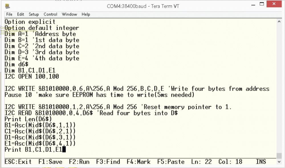 Try I2C WRITE &B1010000,1,2,A\256,A Mod 256 'Reset memory pointer to 1. as the write before the read. In general when reading after sending an address the write should use option 1 to avoid sending a stop code UPDATE: If you are using the 24C32 on a DS3231 board the default address is &B1010111 The following code is tested and works on a Micromite b32 with a DS3231 board option explicit option default integer dim A=1 'Address byte dim B=1 '1st data byte dim C=2 '2nd data byte dim D=3 '3rd data byte dim E=4 '4th data byte dim d6$ DIM B1,C1,D1,E1 I2C OPEN 100,0 I2C WRITE &B1010111,0,6,A\256,A Mod 256,B,C,D,E 'Write four bytes from address 1 Pause 10 'make sure EEPROM has time to write(5ms needed) I2C WRITE &B1010111,1,2,A\256,A Mod 256 'Reset memory pointer to 1. I2C READ &B1010111,0,4,D6$ 'Read four bytes into D$ Print len(D6$) B1=asc(mid$(D6$,1,1)) C1=asc(mid$(D6$,2,1)) D1=asc(mid$(D6$,3,1)) E1=asc(mid$(D6$,4,1)) Print B1,C1,D1,E1 |