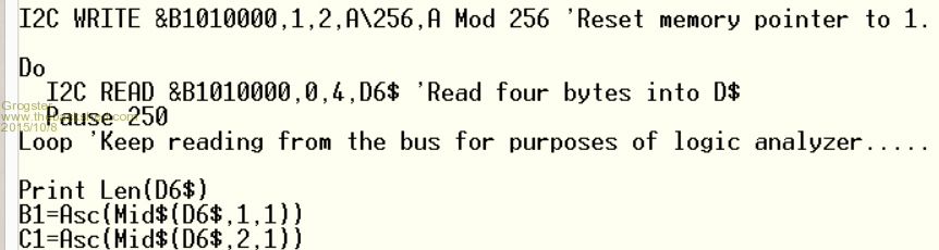 Just when I thought I had nailed my I2C EEPROM issues, I am having major issues trying to read and write to a 24LC32A. This device uses word addressing as most EEPROM chips or FRAM does, but the code that does work fine on a FRAM chip, won't work on this device. Is there something special about the 24LC32 which would make it incompatible with the I2C commands? I am trying to talk to it on a MM+. Test code: A=1 'Address byte B=1 '1st data byte C=2 '2nd data byte D=3 '3rd data byte E=4 '4th data byte I2C OPEN 100,100 I2C WRITE &B1010000,0,6,A\256,A Mod 256,B,C,D,E 'Write four bytes from address 1 Pause 10 'make sure EEPROM has time to write(5ms needed) I2C WRITE &B1010000,0,2,A\256,A Mod 256 'Reset memory pointer to 1. Pause 10 I2C READ &B1010000,0,4,D$ 'Read four bytes into D$ Print len(D$) B1=asc(mid$(D$,1,1)) C1=asc(mid$(D$,2,1)) D1=asc(mid$(D$,3,1)) E1=asc(mid$(D$,4,1)) Print B1,C1,D1,E1 This code always returns with: 4 0 2 0 0 I am expecting and needing it to return with: 4 1 2 3 4 I can't see what the hell I am doing wrong, and my brain now hurts - especially as I thought I had nailed these feckin' EEPROM chips.
