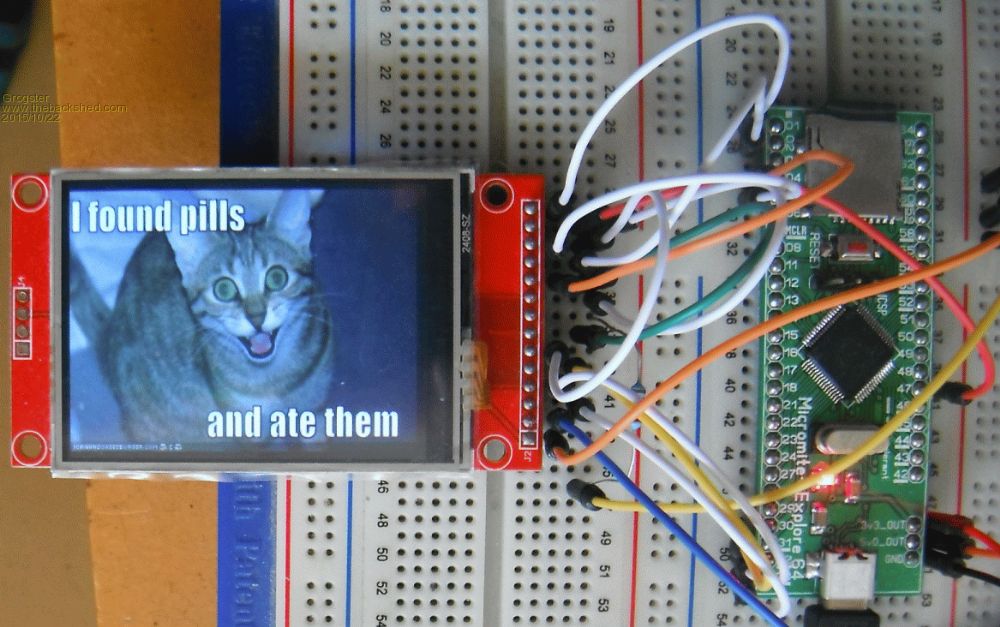 Thanks Grogs for testing that. I will have to wait until the next lot of ILI9341's arrive before I think this matter will be resolved. It has to be the display as everything else has been tested and retested. As I mentioned to Geoff, I just hope this is not another repeat of the Distance Module scenario where initially some people's worked, and others didn't i.e. the source of the 'not-quite-standard' module impacted you outcome. Thanks again to all those that have posted here with your results. PS I will try your cat image shortly just in case my TFT doesn't like Geoff's Tiger!!