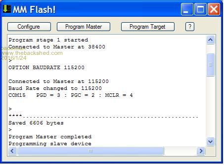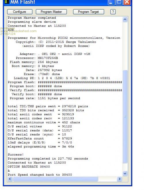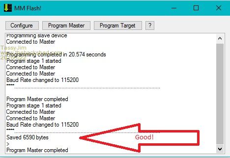 5. Hit the "Program Master" button and got the output in first screen below. (I think I may have had to hit the "Configure" button again before I did this, but can't remember). 6. Hit the "Flash Target" button, navigated to where I had the MM2 V5.1 .hex file when it asked for it and away it went. |