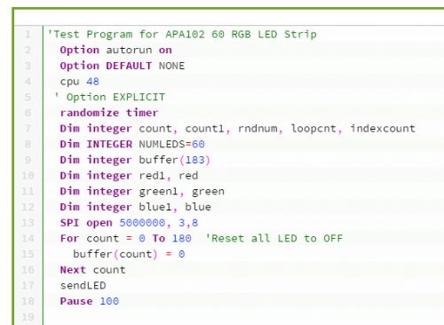 Here is the APA102 project by Bill.b http://circuitgizmos.com/projects/microboard-micromite-projects/apa-102-led-strip/ Micromites and Maximites! - Beginning Maximite |