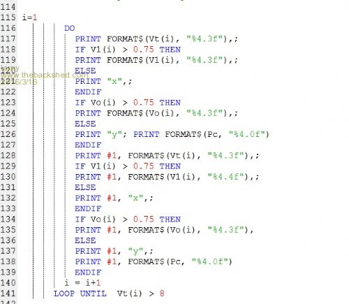 Sorry, I made a mistake, the end of code: IF Vo(i) > 0.75 THEN PRINT #1, FORMAT$(Vo(i), "%4.3f"), ELSE PRINT #1, "y",; PRINT #1, FORMAT$(Pc, "%4.0f") ENDIF i = i+1 LOOP UNTIL Vt(i) > 8 drkl |