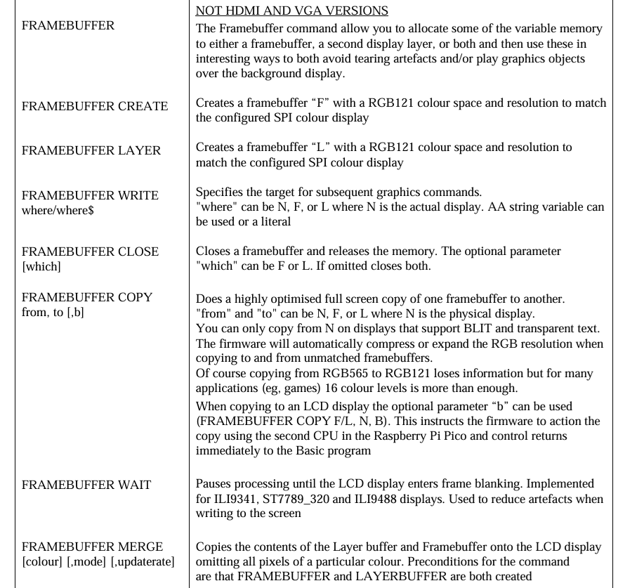 Stan, On VGA and HDMI the screen memory (FRAMEBUFFER N) is inside the pico. And also the FRAMEBUFFER LAYER memory is inside the pico. The VGA/HDMI shows L overlayed on N automatically (assuming you have FRAMEBUFFER L enabled). The overlaying is part of the video driver, and happens real time when generating the video data that is put on the HDMI/VGA cable. On an LCD screen the FRAMEBUFFER N is actually inside the LCD itself, so overlaying L is very slow (via SPI get pixel data from the LCD, combine it with data in L, and SPI write it back to screen). The trick that is used is to create a "virtual" framebuffer in memory (FRAMEBUFFER F) and the same overlay FRAMEBUFFER L. The FRAMEBUFFER MERGE command (for LCD's only) merges the RAM values in F and L, and blasts that at maximum speed to the LCD. So the LCD is not read, it is only used as an output device when this happens. This is much faster, and allows to use the LCD for video games. Volhout PicomiteVGA PETSCII ROBOTS |