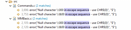 Peter, Since the new parameter type // has been added to the error() message format the errors for trying to use //000 and /&00 to represent a Null character are being formatted as integers. e.g. "Null character 0&00 in escape sequence - use CHR" "Null character 0000 in escape sequence - use CHR" "Null character 2007AEA7&00 in escape sequence - use CHR(0)" "Null character 80000000000 in escape sequence - use CHR(0)" Suggested this new error message is used in place of the current error message at the locations below. i.e. don't included the //000 and /&00 which are being formatted. if(i==0)error("Illegal escape sequence, use CHR$(0) for the Null character","$"); ![]() F4 H7FotSF4xGT |