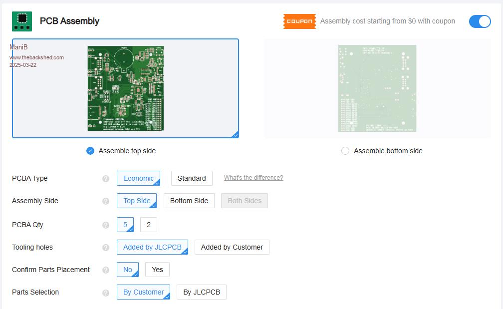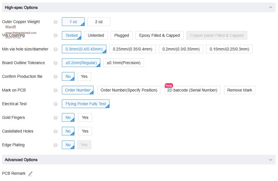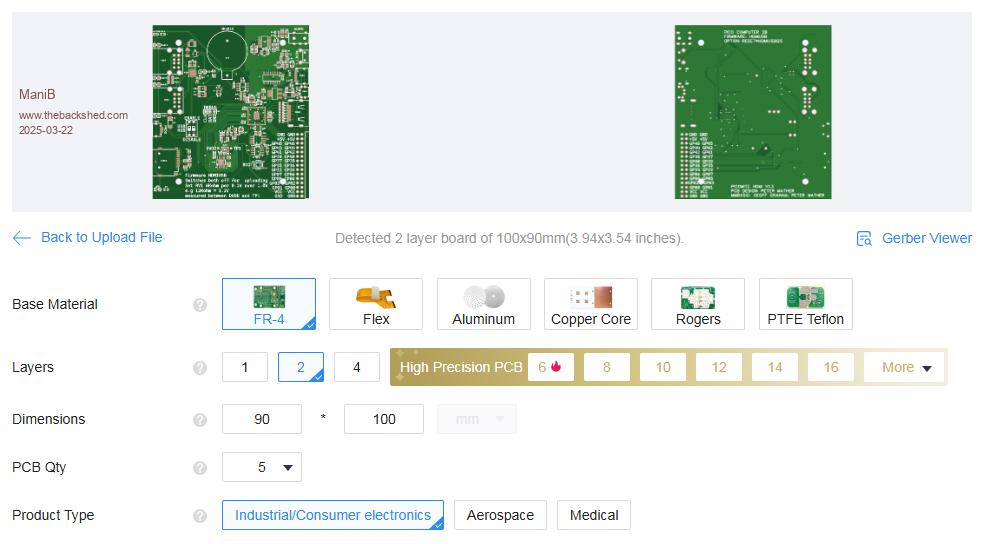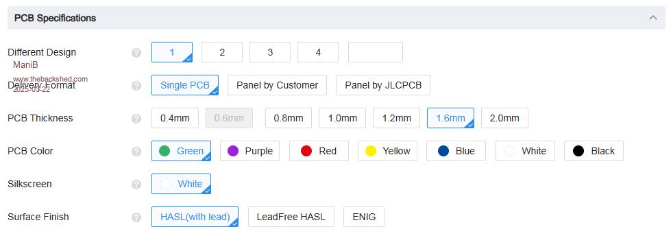 Hello Peter, many thanks for your great work. As already announced, I would now place my first order at https://jlcpcb.com/. I have uploaded the zip file of the Gerber files and adopted these settings. Is that OK so far? ![]() ![]() ![]() ![]() |