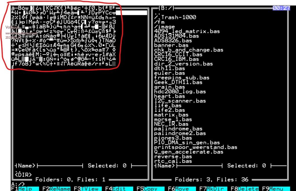 Michael, I guess that is what he meant. Vadim will focus on the VGA/HDMI version, accepting suggestions. But the console version should be branched of. Maybe we take your 02017 version as a starting point, and start removing things that will not work anyway on console (sound/picture view). And maybe (in line with the single pane file manager in CMM2) change the "xxx.bas" files color, so they stand out. CMM2 filemanager ![]() Teraterm is perfect since it has the Terminal (MS-DOS) font. Putty however should also work. The default Ubuntu build Putty does not have the Terminal font, but works acceptable. Only the frame (graphics characters) are not supported. The frame consists of blocks. Maybe the Terminal font can be added to Linux. But it may be copyrighted Microsoft (not open source). Regards, Volhout Edited 2025-03-14 18:08 by Volhout PicomiteVGA PETSCII ROBOTS |