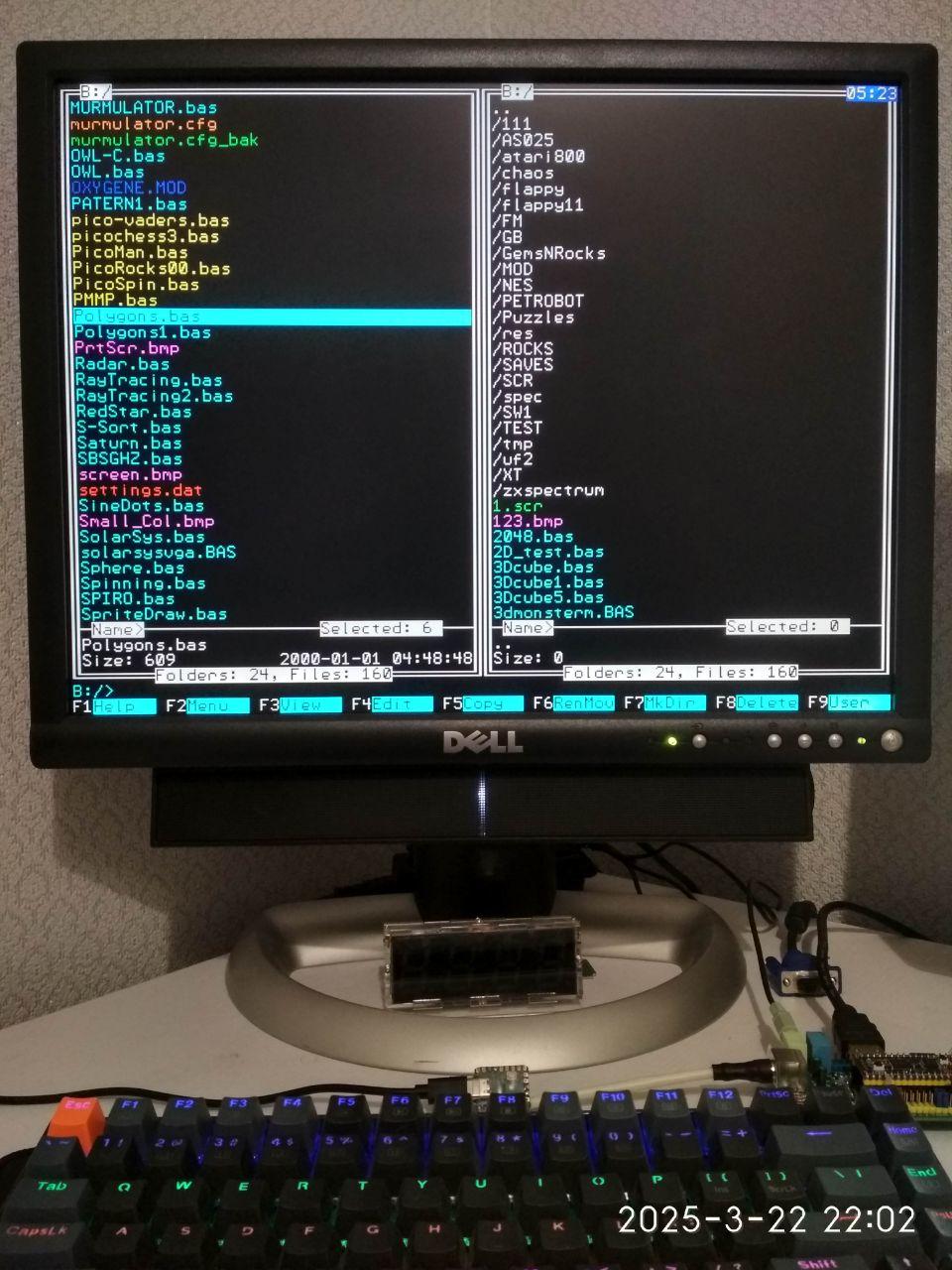 Unbelievable you made it just in one day! It is already very well usable and only polishing is left. Congratulation! I tested it on a RP2040. Very good that it is suitable for all. What does not work is to change the drive letter on a panel and to get down to the input prompt. That the "screensaver" is as well functional is amazing but should be left out ;) Exiting just by pressing escape only once is too less. If enter is pressed on a *.bmp then it tries to load but without error handling Edited 2025-03-13 07:46 by dddns |
