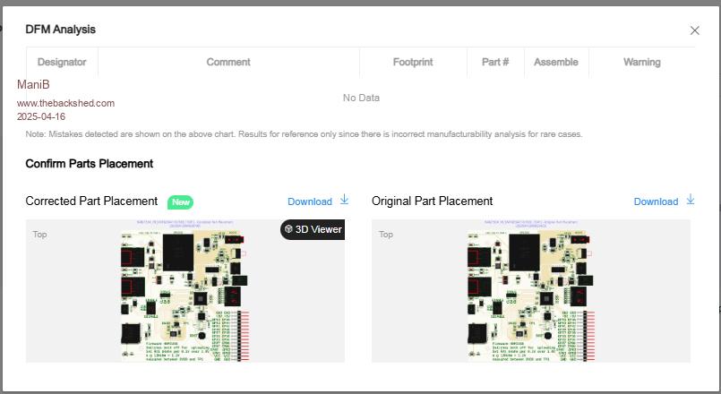 @Peter Mather I had a look at the DFM analysis of your board and downloaded the two pictures. I didn't notice any difference. ![]() But then I handed it over to AI Grok and asked to list the differences. This is the answer: The two images show printed circuit boards (PCBs) labeled "Corrected Part Placement" (20250412904500799) and "Original Part Placement" (2025041290823423). At first glance, they look very similar, but there are some differences I can identify: 1. Component placement at C85 (top left): In the "Corrected" image, C85 (near PORT4) is present. In the "Original" image, C85 is either missing or not populated. 2. Labeling at SW16 (USB HUB): In the "Corrected" image, the "ENABLE" label at SW16 is clearly visible. In the "Original" image, the "ENABLE" label at SW16 appears less clear or is missing. 3. Resistor R33 (top right): In the "Corrected" image, R33 (near the AUDIO label) is present. In the "Original" image, R33 is either missing or not populated. 4. Component C104 (right center): In the "Corrected" image, C104 (near U21) is present. In the "Original" image, C104 is either missing or not populated. 5. Labeling at U24 (center right): In the "Corrected" image, the labeling at U24 (near C107) is clearer and more distinct. In the "Original" image, the labeling at U24 is less clear. Contextual Interpretation: Since the "Corrected" image is marked as a corrected version, the differences suggest that missing or incorrectly placed components (like C85, R33, C104) were added or fixed. The clearer labels might also indicate revised documentation or an improved layout. Conclusion: The differences are subtle but mainly involve the addition or correction of components and the clarity of labels. The "Corrected" image appears to be an improved version of the "Original" image, which aligns with the title. ![]() |