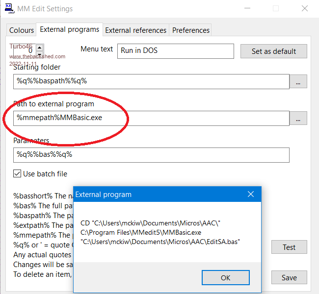 No Bill, the original DOS settings should work without any changes other than ticking the 'use batch' box. You can now use a single quote instead of %q% for the double quote place holders. Either way will work. The single quote is easier to see whats happening. The 'test' button will show you what the filled out commands look like for the current bas file. Can you show me what your settings are. Either a screen dump of the setting page or the Ext0 = line from your MMEdit.inf Jim VK7JH MMedit |