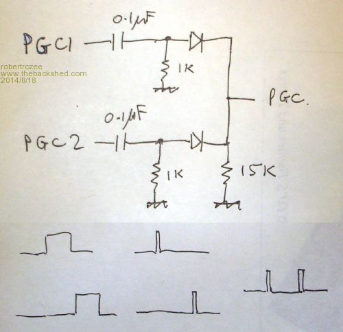 the pulses should be somewhere in the region of 0.1ms wide. the two diodes and 15k resistor form a simple OR gate. adding a small capacitor across the 15k resistor will delay the pulses slightly, though i suspect this will not be needed. i am assuming that you can set the state of PGD, PGC1 and PGC2 all in the same usb packet? rob :-) |