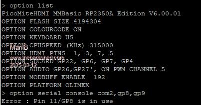 if I can help but is is it the same board? 1- use the option list I posted for olimex usb which sets sound and sd card and usb to ttl converter. 2- as above 1 3- a usb keyboard should show on boot. it can be a wireless dongle for a mini keyboard with a mouse touch Connected to COM3 at 115200 > option list PicoMiteHDMI MMBasic USB RP2350A Edition V6.00.02b0 OPTION SERIAL CONSOLE COM2,GP8,GP9 OPTION AUTORUN ON OPTION FLASH SIZE 4194304 OPTION COLOURCODE ON OPTION KEYBOARD UK, 0, 0, 600, 150 OPTION CPUSPEED (KHz) 315000 OPTION HDMI PINS 1, 3, 7, 5 OPTION SDCARD GP22, GP6, GP7, GP4 OPTION AUDIO GP26,GP27', ON PWM CHANNEL 5 > |