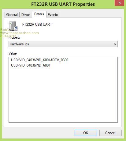 Don, not quite sure I follow you but I did some checking and my alternate system (win 8.1 64 bit) automatically installed FTDI driver version 2.10.0.0. When I tried updating with the latest driver from FTDI I was told by Windows that I have the latest. My main system, as I said, would not install a driver even when I tried to push it down its throat. See the pic below. Windows identifies the chip OK (I think, anyone confirm?). |