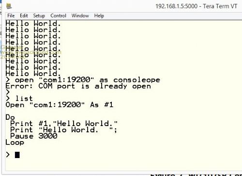 The errors in this screenshot are cos my first test was "Hello World" as you can see, then I tried to open the com port as console without closing it, so it looks a little confusing there, but the MM is happily responding fine in both directions. This is the CG CMM2, on COM1 for the purposes of testing. I don't think that the CMM can go faster then 19k2, as both COM ports on the CMM are software driven - can't remember - will try some higher baud rates, and will probably get an error from MMBASIC if I exceed the maximum baud rate. NOW I will hook up a standard 28 pin uM on a breadboard and hook that into the mix, as perhaps the USB chip on the 44 was upsetting the serial timing. Does not matter really, as it was a full size MM I was wanting to talk to on the net rather then a uM anyway - I just got my hands on a 44 before the MM board. Smoke makes things work. When the smoke gets out, it stops! |