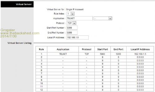Getting there! Re port forwarding. Did you choose Telnet from a list or add a new server? If you chose from a list, the modem might be forwarding external port 5000 to port 23 You may have to create a new server and call it anything you like. You should then have the option to set the destination port(s) I much preferred modem/routers when they didn't try to be so 'helpful' and you could just enter the correct details. Hopefully, you can use another internet connection to test the port forwarding. Some modems will let you address your external IP and do the forwarding correctly but others will not. Jim VK7JH MMedit |