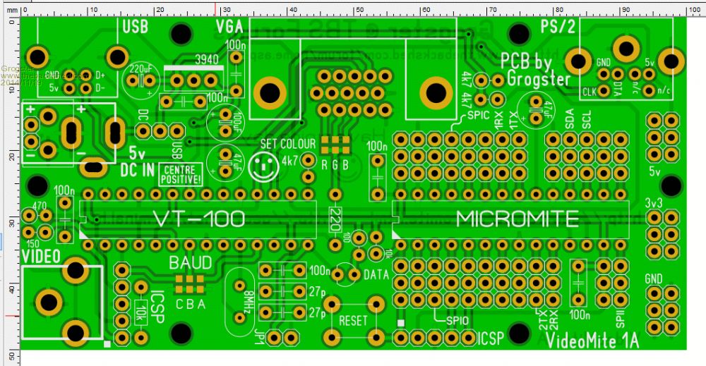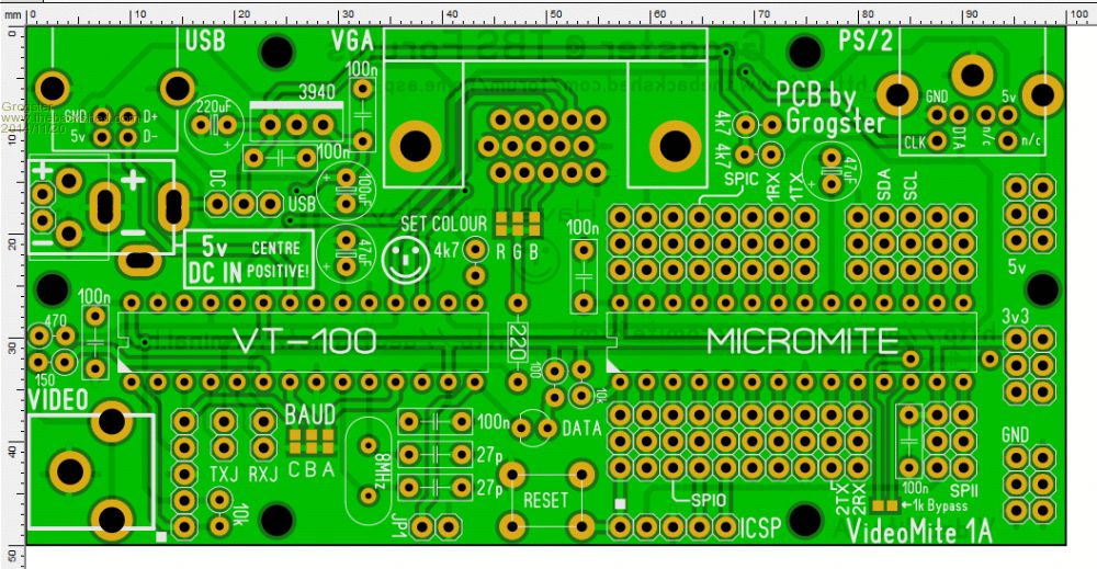 Thanks for that turn-around info. Here is the image with the changes you suggested: EDIT: I have added two jumpers - TXJ and RXJ. With these jumpers in place, the uM is routed to the VT100. If you remove them, you can then use lower pins of those jumpers, and the GND from the adjacent ICSP, as a serial connection to the VT100 if you want to use it separate from the on-board Micromite in testing other hook-ups. Likewise, you can remove these same jumpers, and then tap into the Micromite console, without the VT100 upsetting the mix by being permanently connected. The normal arrangement, would be jumpers on these two points(and transfer code to the Micromite via the VT100's USB interface), but it gives you the flexibility to alter things depending on what you happen to be doing.