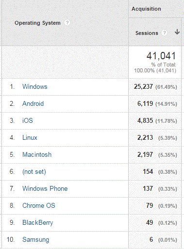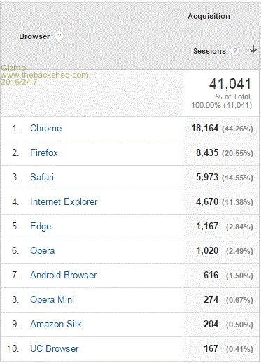 Some stats for this web site, data for last month. Sessions are a bit like a visitor counter. First up, what OS. Looking at Windows users. XP still kicking along. Win98 even pops in occasionally. And what browser's are used. Glenn The best time to plant a tree was twenty years ago, the second best time is right now. JAQ |