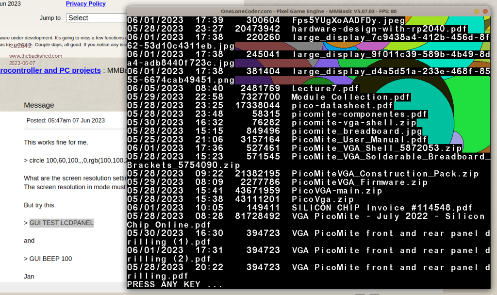 Hello, both tests work fine. The options was default, I just unzip and run. but the path go to my documents. The edit still not work the result of option list option default mode 9 1024x768 option default font 3,1 option default path <my documents> option keyboard uk current display 32,64 when I type edit [enter] Nothing to edit > Instead go to editor. ![]() ![]() Maybe I am making some thing wrong for the editor not work. And the ( " ) character not work. This occurred in gfxterm terminal using raspberry pico too. Tkz. After test (gui test lcdpanel) , the circle start work. ![]() Best regards, Edited 2023-06-07 12:15 by ice2642 MMBasic 5.0707 on PicoMite VGA |