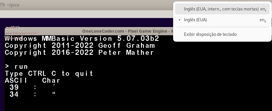 It seems it doesn't even support as per the terminal. The windows version does not. The simplest way for anyone using an international US keyboard is to leave the 2 configurations in the system and switch to the default US when running MMBasic. The funny thing is that connecting through Putty or minicom works without any problem, so it can be assumed that it is not MMBasic, but the terminal used. In this case, the windows version uses a game engine to display the graphics (Pixel game engine) and I think that it is having a problem with the keyboard, the same thing with gfxterm that also had this problem, but I don't know if the same engine was used . MMBasic 5.0707 on PicoMite VGA |