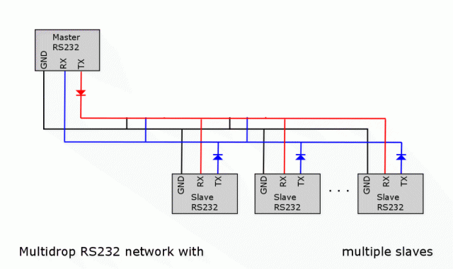 The master RX pin should have a pull-up and the diodes on the slaves should be pointing down. Their TX pins will normally be high, and the master RX pin will be pulled high. Each slave can then pull the master RX pin low via its diode. The master TX pin can just be hard wired to all the slave RX pins as they all receive the same data (each one has an address). You can have an optional pull-up. All the RX pins are high impedance. Mick Zilog Inside! nascom.info for Nascom & Gemini Preliminary MMBasic docs & my PCB designs |