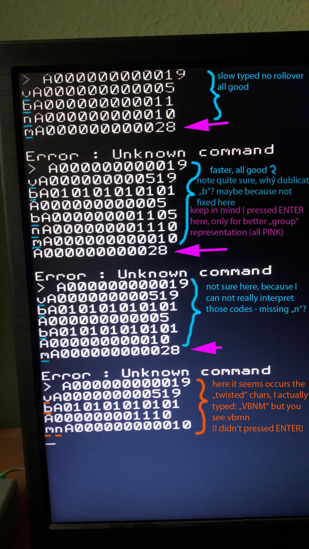 Hi Peter, I am not sure how helpful this is, since my FTDA converter doesn't work with this diagnostic firmware (or I am just too stupid - also possible )But here are two things to keep in mind: 1. this firmware is before the dublicate fix 2. I am not quite sure how to interpret the codes.. some have the real typed letter, some not, but I think I found one sequence which have the twisted chars: ![]() EDIT: maybe it is important: the "mn" (as in orange in the picture) is always in one line like this, so this is reproducible. Also worth to mention: only one keyboard has this spot, other keyboards have others. -Daniel Edited 2025-07-07 03:31 by Amnesie |