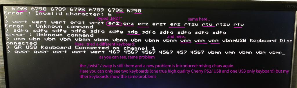 Amnesie I'm determined to get to the bottom of this. Please could you run the attached version which has some diagnostic code in it. Please load the software and then using a computer console type OPTION CONSOLE SERIAL This disables the screen as a console device Then using the USB keyboard type the sequence that gives the duplicated characters until you see a sequence which includes a duplicate In the computer console you will see the characters you typed. On the VGA screen you will see some hex codes which are the report sent by the keyboard. On my USB keyboard, I only ever see duplication of the "H" character and when it is duplicated I get the nonsense code A010101010101 on the screen and it is this which causes the duplication. Google does not suggest this is a generic error code but it is definitely the keyboard that is generating it. If your keyboards are doing the same or something similar I can then finally fix the problem. I've disabled the duplicated key timer as this is just masking the problem rather than fixing it. Thanks for your help Peter For reference these are the codes that the keys on a German keyboard should produce. When typing slowly you will see the code as the right most pair of hex digits. If you press two keys simultaneously you will see both codes in the 4 right digits. onst int DEkeyValue[202] = { 0,0,// USB_HID_KEYBOARD_KEYPAD_RESERVED_NO_EVENT_INDICATED = 0x00, 0,0,// USB_HID_KEYBOARD_KEYPAD_KEYBOARD_ERROR_ROLL_OVER = 0x01, 0,0,// USB_HID_KEYBOARD_KEYPAD_KEYBOARD_POST_FAIL = 0x02, 0,0,// USB_HID_KEYBOARD_KEYPAD_KEYBOARD_ERROR_UNDEFINED = 0x03, 97,65,// USB_HID_KEYBOARD_KEYPAD_KEYBOARD_A = 0x04, 98,66,// USB_HID_KEYBOARD_KEYPAD_KEYBOARD_B = 0x05, 99,67,// USB_HID_KEYBOARD_KEYPAD_KEYBOARD_C = 0x06, 100,68,// USB_HID_KEYBOARD_KEYPAD_KEYBOARD_D = 0x07, 101,69,// USB_HID_KEYBOARD_KEYPAD_KEYBOARD_E = 0x08, 102,70,// USB_HID_KEYBOARD_KEYPAD_KEYBOARD_F = 0x09, 103,71,// USB_HID_KEYBOARD_KEYPAD_KEYBOARD_G = 0x0A, 104,72,// USB_HID_KEYBOARD_KEYPAD_KEYBOARD_H = 0x0B, 105,73,// USB_HID_KEYBOARD_KEYPAD_KEYBOARD_I = 0x0C, 106,74,// USB_HID_KEYBOARD_KEYPAD_KEYBOARD_J = 0x0D, 107,75,// USB_HID_KEYBOARD_KEYPAD_KEYBOARD_K = 0x0E, 108,76,// USB_HID_KEYBOARD_KEYPAD_KEYBOARD_L = 0x0F, 109,77,// USB_HID_KEYBOARD_KEYPAD_KEYBOARD_M = 0x10, 110,78,// USB_HID_KEYBOARD_KEYPAD_KEYBOARD_N = 0x11, 111,79,// USB_HID_KEYBOARD_KEYPAD_KEYBOARD_O = 0x12, 112,80,// USB_HID_KEYBOARD_KEYPAD_KEYBOARD_P = 0x13, 113,81,// USB_HID_KEYBOARD_KEYPAD_KEYBOARD_Q = 0x14, 114,82,// USB_HID_KEYBOARD_KEYPAD_KEYBOARD_R = 0x15, 115,83,// USB_HID_KEYBOARD_KEYPAD_KEYBOARD_S = 0x16, 116,84,// USB_HID_KEYBOARD_KEYPAD_KEYBOARD_T = 0x17, 117,85,// USB_HID_KEYBOARD_KEYPAD_KEYBOARD_U = 0x18, 118,86,// USB_HID_KEYBOARD_KEYPAD_KEYBOARD_V = 0x19, 119,87,// USB_HID_KEYBOARD_KEYPAD_KEYBOARD_W = 0x1A, 120,88,// USB_HID_KEYBOARD_KEYPAD_KEYBOARD_X = 0x1B, 122,90,// USB_HID_KEYBOARD_KEYPAD_KEYBOARD_Y = 0x1C, 121,89,// USB_HID_KEYBOARD_KEYPAD_KEYBOARD_Z = 0x1D, 49,33,// USB_HID_KEYBOARD_KEYPAD_KEYBOARD_1_AND_EXCLAMATION_POINT = 0x1E, 50,34,// USB_HID_KEYBOARD_KEYPAD_KEYBOARD_2_AND_AT = 0x1F, 51,0,// USB_HID_KEYBOARD_KEYPAD_KEYBOARD_3_AND_HASH = 0x20, DE: §=245 52,36,// USB_HID_KEYBOARD_KEYPAD_KEYBOARD_4_AND_DOLLAR = 0x21, 53,37,// USB_HID_KEYBOARD_KEYPAD_KEYBOARD_5_AND_PERCENT = 0x22, 54,38,// USB_HID_KEYBOARD_KEYPAD_KEYBOARD_6_AND_CARROT = 0x23, 55,47,// USB_HID_KEYBOARD_KEYPAD_KEYBOARD_7_AND_AMPERSAND = 0x24, 56,40,// USB_HID_KEYBOARD_KEYPAD_KEYBOARD_8_AND_ASTERISK = 0x25, 57,41,// USB_HID_KEYBOARD_KEYPAD_KEYBOARD_9_AND_OPEN_PARENTHESIS = 0x26, 48,61,// USB_HID_KEYBOARD_KEYPAD_KEYBOARD_0_AND_CLOSE_PARENTHESIS = 0x27, 10,10,// USB_HID_KEYBOARD_KEYPAD_KEYBOARD_RETURN_ENTER = 0x28, 27,27,// USB_HID_KEYBOARD_KEYPAD_KEYBOARD_ESCAPE = 0x29, 8,8,// USB_HID_KEYBOARD_KEYPAD_KEYBOARD_DELETE = 0x2A, 9,0x9f,// USB_HID_KEYBOARD_KEYPAD_KEYBOARD_TAB = 0x2B, 32,32,// USB_HID_KEYBOARD_KEYPAD_KEYBOARD_SPACEBAR = 0x2C, 0,63,// USB_HID_KEYBOARD_KEYPAD_KEYBOARD_MINUS_AND_UNDERSCORE = 0x2D, DE: ß=225 0,96,// USB_HID_KEYBOARD_KEYPAD_KEYBOARD_EQUAL_AND_PLUS = 0x2E, DE: ´=239 0,0,// USB_HID_KEYBOARD_KEYPAD_KEYBOARD_OPEN_BRACKET_AND_OPEN_CURLY_BRACE = 0x2F, DE: ü=129,Ü=154 43,42,// USB_HID_KEYBOARD_KEYPAD_KEYBOARD_CLOSE_BRACKET_AND_CLOSE_CURLY_BRACE = 0x30, 35,39,// USB_HID_KEYBOARD_KEYPAD_KEYBOARD_BACK_SLASH_AND_PIPE = 0x31, 35,39,// USB_HID_KEYBOARD_KEYPAD_KEYBOARD_NON_US_HASH_AND_TILDE = 0x32, 0,0,// USB_HID_KEYBOARD_KEYPAD_KEYBOARD_SEMICOLON_AND_COLON = 0x33, DE: ö=228,Ö=229 0,0,// USB_HID_KEYBOARD_KEYPAD_KEYBOARD_APOSTROPHE_AND_QUOTE = 0x34, DE: ä=132,Ä=142 94,0,// USB_HID_KEYBOARD_KEYPAD_KEYBOARD_GRAVE_ACCENT_AND_TILDE = 0x35, DE: °=167 44,59,// USB_HID_KEYBOARD_KEYPAD_KEYBOARD_COMMA_AND_LESS_THAN = 0x36, 46,58,// USB_HID_KEYBOARD_KEYPAD_KEYBOARD_PERIOD_AND_GREATER_THAN = 0x37, 45,95,// USB_HID_KEYBOARD_KEYPAD_KEYBOARD_FORWARD_SLASH_AND_QUESTION_MARK = 0x38, 0,0,// USB_HID_KEYBOARD_KEYPAD_KEYBOARD_CAPS_LOCK = 0x39, 0x91,0xB1,// USB_HID_KEYBOARD_KEYPAD_KEYBOARD_F1 = 0x3A, 0x92,0xB2,// USB_HID_KEYBOARD_KEYPAD_KEYBOARD_F2 = 0x3B, 0x93,0xB3,// USB_HID_KEYBOARD_KEYPAD_KEYBOARD_F3 = 0x3C, 0x94,0xB4,// USB_HID_KEYBOARD_KEYPAD_KEYBOARD_F4 = 0x3D, 0x95,0xB5,// USB_HID_KEYBOARD_KEYPAD_KEYBOARD_F5 = 0x3E, 0x96,0xB6,// USB_HID_KEYBOARD_KEYPAD_KEYBOARD_F6 = 0x3F, 0x97,0xB7,// USB_HID_KEYBOARD_KEYPAD_KEYBOARD_F7 = 0x40, 0x98,0xB8,// USB_HID_KEYBOARD_KEYPAD_KEYBOARD_F8 = 0x41, 0x99,0xB9,// USB_HID_KEYBOARD_KEYPAD_KEYBOARD_F9 = 0x42, 0x9a,0xBa,// USB_HID_KEYBOARD_KEYPAD_KEYBOARD_F10 = 0x43, 0x9b,0xBb,// USB_HID_KEYBOARD_KEYPAD_KEYBOARD_F11 = 0x44, 0x9c,0xBc,// USB_HID_KEYBOARD_KEYPAD_KEYBOARD_F12 = 0x45, 0x9d,0xBd,// USB_HID_KEYBOARD_KEYPAD_KEYBOARD_PRINT_SCREEN = 0x46, 0,0,// USB_HID_KEYBOARD_KEYPAD_KEYBOARD_SCROLL_LOCK = 0x47, 0x9e,0x9e,// USB_HID_KEYBOARD_KEYPAD_KEYBOARD_PAUSE = 0x48, 0x84,0x84,// USB_HID_KEYBOARD_KEYPAD_KEYBOARD_INSERT = 0x49, 0x86,0x86,// USB_HID_KEYBOARD_KEYPAD_KEYBOARD_HOME = 0x4A, 0x88,0x88,// USB_HID_KEYBOARD_KEYPAD_KEYBOAR