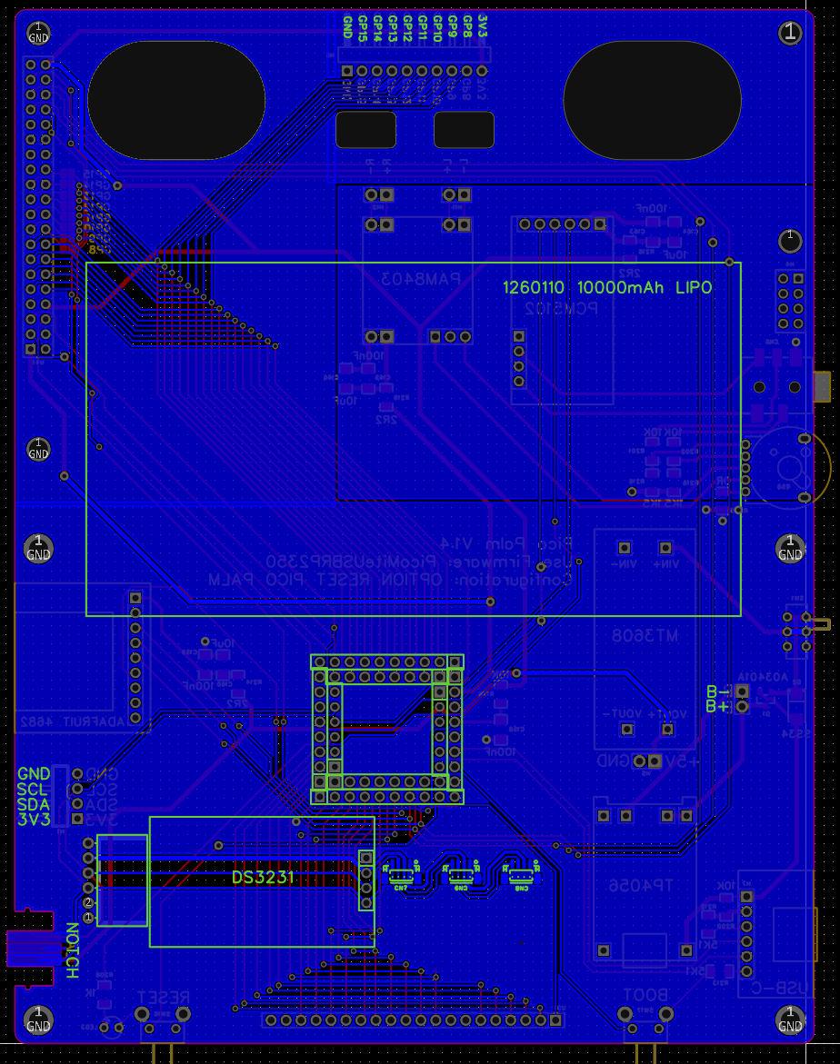 There is an external port with the system i2c allowing you to connect any i2c device, e,g, a Wii Classic. There are also 8 pins (GP8-GP15) assigned to DB8-DB15 on the display. The user can choose to run the display in 8-bit mode (RGB888) slowest but still fast, 12-bit mode (RGB888) mid-speed, or 16-bit mode (RGB565) blazingly fast. By default the Palm Pico set up will assume 12 bit mode leaving GP12-GP15 unallocated. There are zero ohm resistors in the path to the display on the board which can be omitted in the BOM or removed later depending on the user's preference. DB8-DB15 are connected to a header at the top of the board. Edited 2025-10-05 21:45 by matherp |