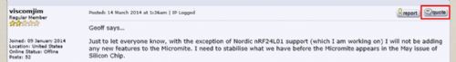 Geoff says… Just to let everyone know, with the exception of Nordic nRF24L01 support (which I am working on) I will not be adding any new features to the Micromite. I need to stabilise what we have before the Micromite appears in the May issue of Silicon Chip. So bug reports are welcome but please hold back on the new features. Geoff Just so you know, Nordic says its a drop in replacement so code should be the same… This product is not recommended for new designs. Nordic recommends its drop-in compatible nRF24L01+ or for a System-on-Chip solution the Nordic nRF24LE1 or nRF24LU1+ Can't wait for this feature!!! Sorry I don't know how to do the white box around other peoples quotes yet, but I swear I will learn... |