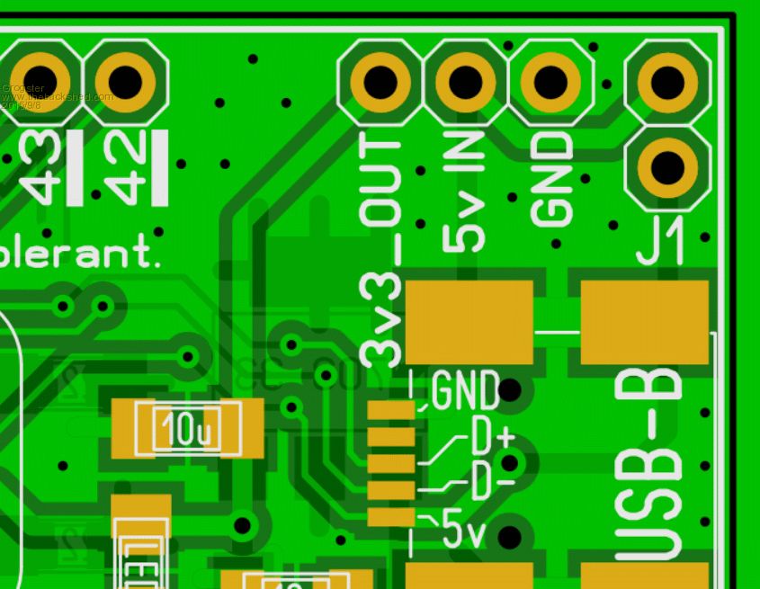 Grogs, One last suggestion if I may, and it won't take up any extra board space. If you slightly stagger the alternate PINS of the ICSP footprint people will be able to Press Fit a header in there long enough to Flash the Device, without having to permanently mount one. Here is an example from another Board to show what I mean.