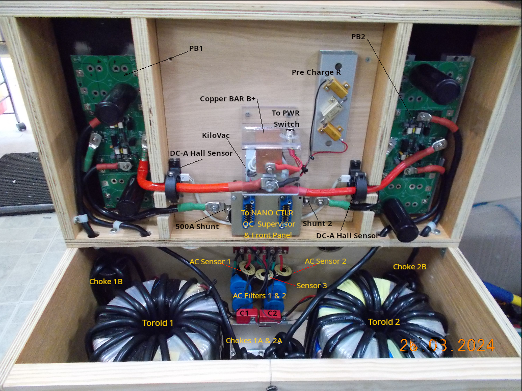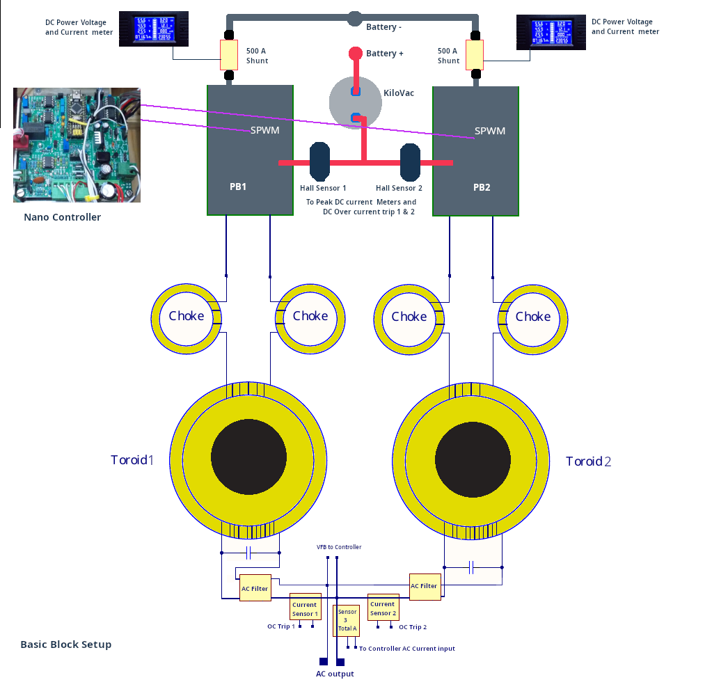 This is a simple, admittedly not very good, basic block layout. Hopefully gives an idea of how simple it is to add a second power stage and toroid. IMHO This is far easier than winding a single 12kw Toroid, as this Inverter is running our workshop and home 100% fully off grid, adding the extra monitoring sensors, safety current trip circuits and spacious easy to service layout and cabinet was fully justified, especially considering how critical this Inverter is to our life and security. We are clocking around 1230kWh to 1570kWh per quarter. All electric appliances, everything on the property runs from Inverter 230Vac. ![]() ![]() . Edited 2026-04-04 12:16 by KeepIS NANO:Inverter V 8.2ks - Linux AvrDude GUI script V4.1 |