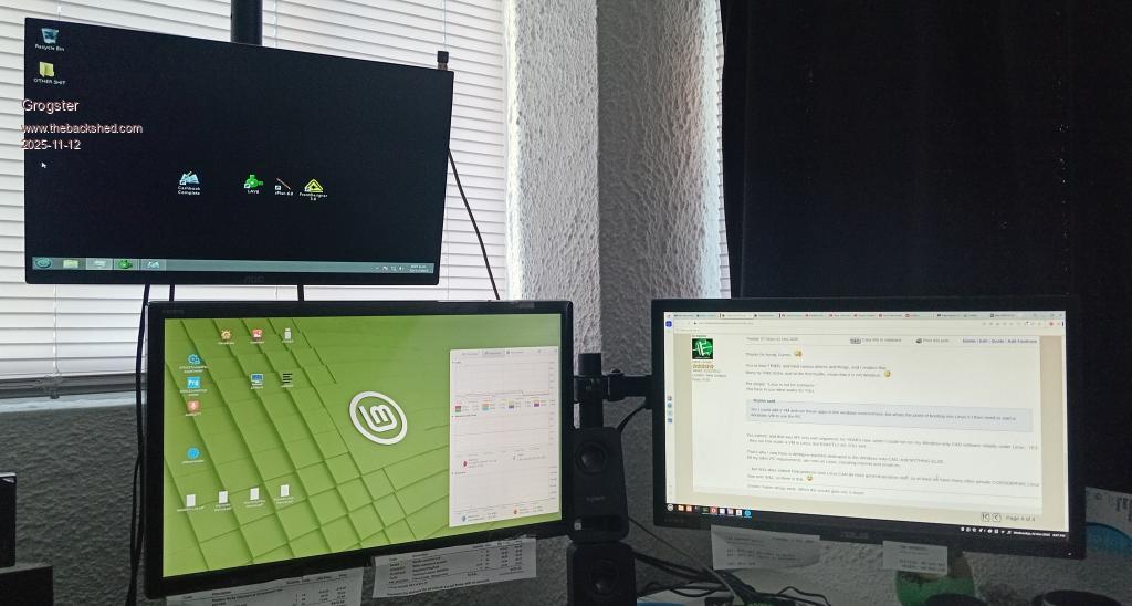 Thanks for trying, Gizmo. You at least TRIED, and tried various distros and things, and I respect that. Many try ONE distro, and at the first hurdle, moan that it is not Windoze. Put simply: "Linux is not for everyone." You have to use what works for YOU. Yes indeed, and that was MY very own argument, for YEARS now, when I could not run my Windoze-only CAD software reliably under Linux. YES - they run fine inside a VM in Linux, but EXACTLY AS YOU SAY...... That's why I now have a WIN8pro machine dedicated to the Windoze-only CAD, and NOTHING ELSE. All my other PC requirements, are now on Linux, including Internet and email etc. ....but W11 does indeed help promote how Linux CAN do most general-purpose stuff, so at least we have many other people CONSIDERING Linux now over W11, so there is that. ![]() EDIT: Here is my current setup. ![]() WIN8pro on the top-left monitor, Linux Mint on the bottom two monitors. WIN8pro does all my CAD, Linux Mint does everything else. Edited 2025-11-12 17:12 by Grogster Smoke makes things work. When the smoke gets out, it stops! |