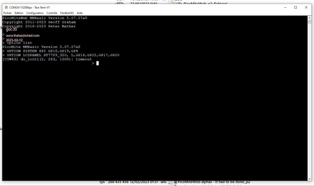 Not sure if this will provide any clues. I don't have a reset button wired, so just power on/off to reset. Since a8 version I can only get it to communicate if directly connected via TerraTerm. If connected via MMCC or GFXTerm it wont respond on the console. Once working with TerraTerm directly conected to the port, you can disconnect and use the other terminals OK. I did manage to capture this while connected via a different terminal(MicroMite Console by SAGT3K), it may give a clue. It gave response below when connected but would not respond to console. [CYW43] do_ioctl(2, 263, 1008): timeout PicoMiteWeb MMBasic Version 5.07.07a10 Copyright 2011-2023 Geoff Graham Copyright 2016-2023 Peter Mather > F4 H7FotSF4xGT |